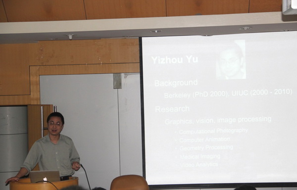 报告中,四位教师首先对港大的教学资源、优势及学校进行相关介绍,然后各教授分别在计算机图形学,信息安全理论,数据处理,图像识别及处理方面做了详细的演讲,报告结束后,俞益洲教授等一行六人同p站