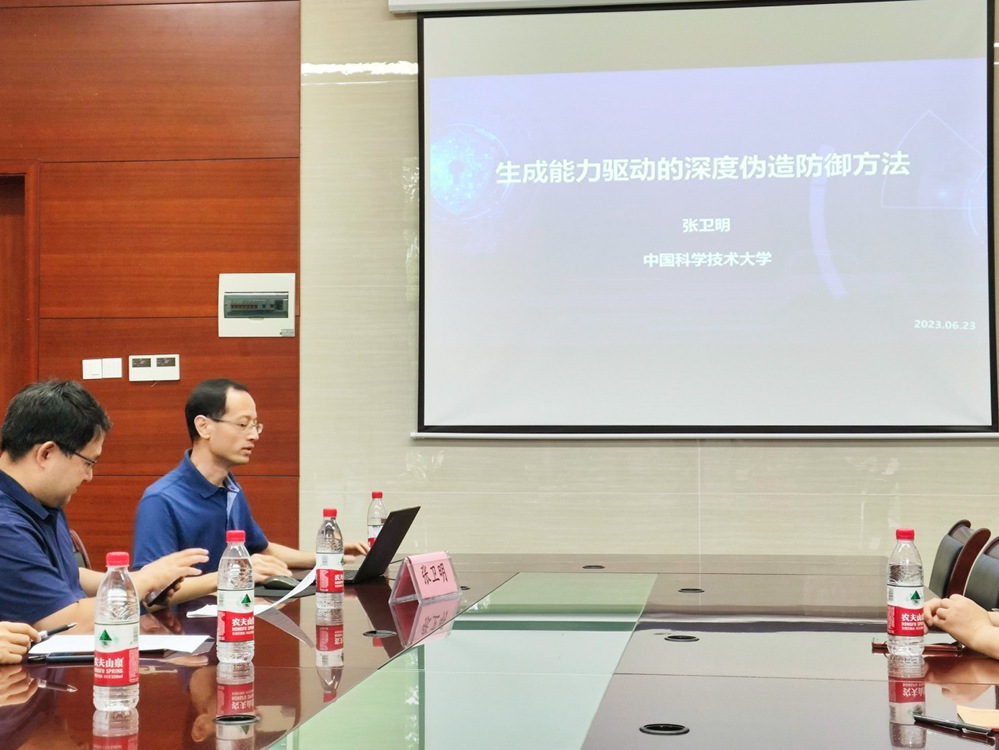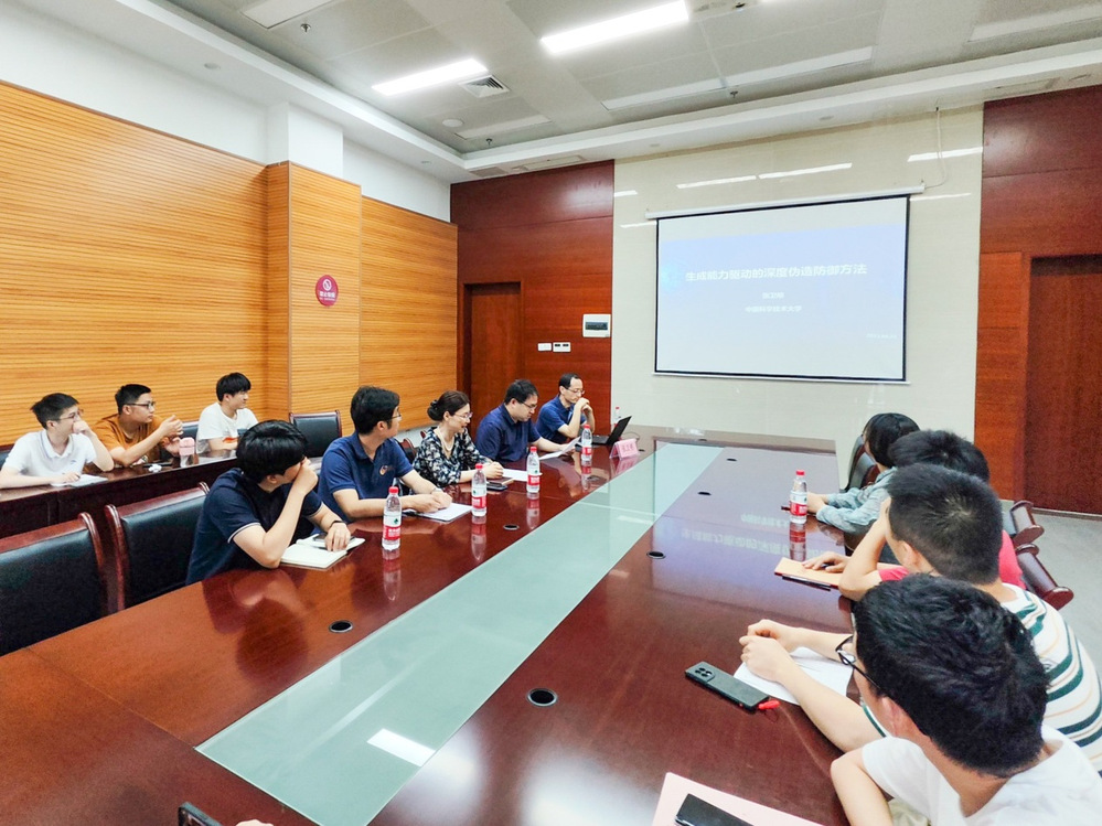作了题为《生成能力驱动的深度伪造防御方法》的学术报告。报告会由贾伟教授主持,学院师生30余人聆听了本次报告。
