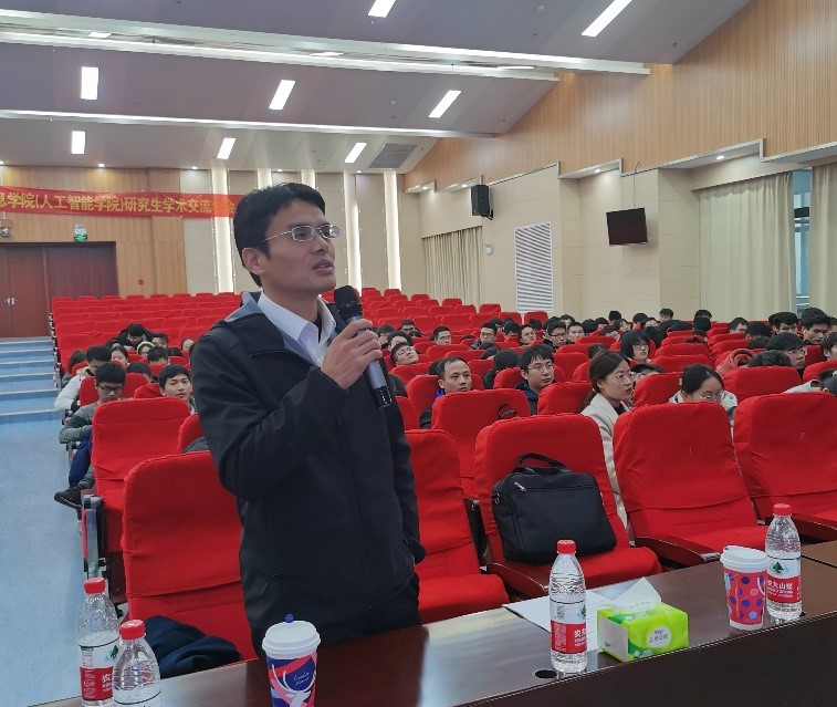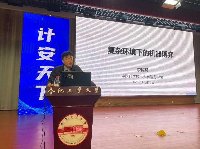 李厚强教授作了“复杂环境下的机器博弈”的学术报告。李教授结合自身5年的机器博弈方面的研究,讲述机器博弈的实际需求和专业性理论,告诉研究生们如何明确自己研究方向的价值;通过机器博弈的建模,告诉研究生们数学建模的重要性;通过博弈论,强化学习,多智能体强化学习三个主要研究方向,告诉研究生如何正确的阅读和整理研究现状,提高学术研究的专业性;通过同学们感兴趣的无人机机器博弈、王者荣耀、国际麻将等方面,分析现有技术在应用中出现的问题,并指出机器博弈中回报平衡、环境学习以及常识利用中仍然存在的问题,鼓励研究生学会总结和思考问题,以获得更大的学术研究成果。