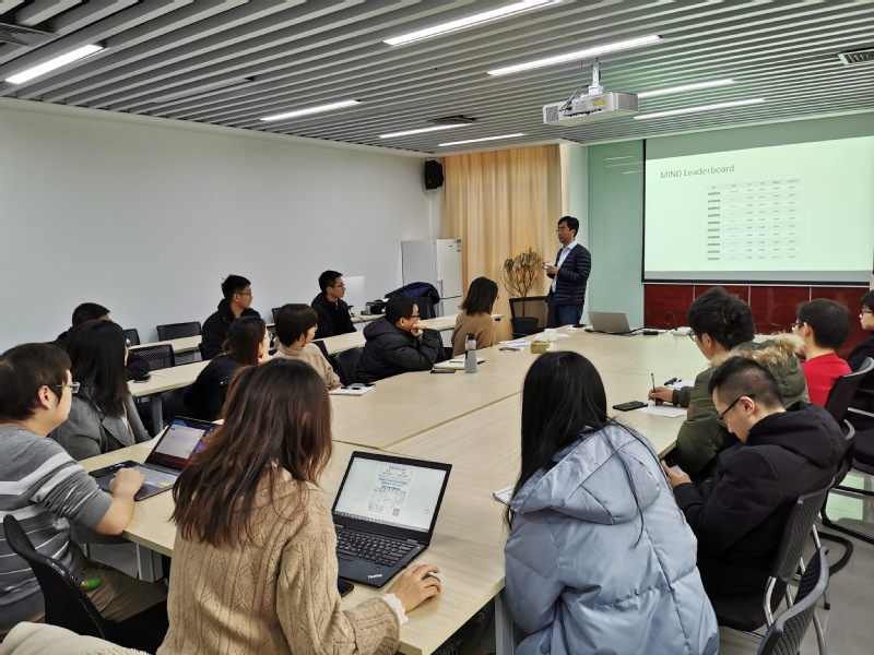 谢幸研究员从新闻推荐的应用背景、新闻推荐的技术挑战以及新闻推荐的最新进展等方面做了深入浅出的介绍。谢研究员首先介绍了新闻推荐的应用背景,在线新闻阅读已经成为了信息获取的重要渠道,新闻推荐不仅提升用户的阅读体验,同时提高了新闻平台的收益。随后介绍了新闻推荐的技术挑战,新闻推荐存在新闻时效性和用户冷启动的问题,此外新闻推荐结果的多样性、社会性和可解释性也需要综合考量。为了应对这些挑战,谢研究员详细介绍了如何借助深度学习、自然语言理解、以及知识图谱等领域的最新进展来提升个性化新闻推荐的效果,包括基于多视角学习的新闻推荐来解决推荐多样性的问题,基于个性化注意力机制来解决用户和新闻个性化表示的问题。最后,谢研究员介绍了该团队发表的大规模新闻推荐数据集MIND,分享了微软推荐团队在社区开源上做出的工作。报告最后,在座师生就感兴趣的话题和实际研究中遇到的问题和谢研究员进行了探讨和学习。