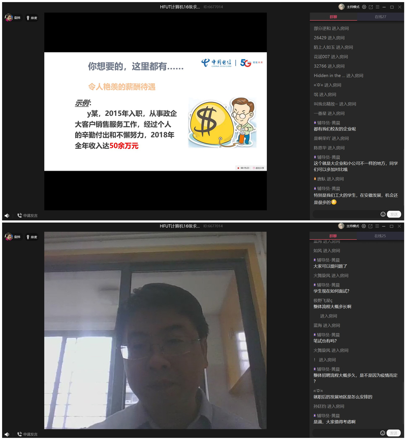 海康威视人事专员陈雨濛、锐捷网络HR林远锋和中国电信安徽分公司招聘负责人袁炜在不同时间段分别进行了持续一小时的线上宣讲,通过直播的方式向学院毕业生介绍本企业的发展历程、文化氛围、岗位需求及优秀校友等,分布在各地的计算机学子在直播间和HR互动、沟通。尤其针对自身关心的问题与宣讲人实时互动:“软件开发都是嵌入式方向的吗?”“公司对应届生有系统的培养路径吗?”,气氛十分热烈。