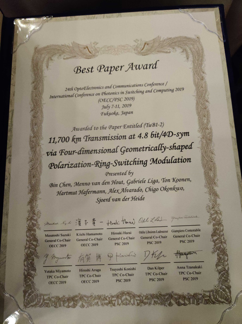 陈斌老师的论文“11,700 km Transmission at 4.8bit/4D-sym via Four-dimensional Geometrically-shaped Polarization-Ring-Switching Modulation”获得了本次会议的最高奖项——最佳论文奖(Best Paper Award)。OECC会议是光通信领域最重要、最具影响的国际学术会议之一。