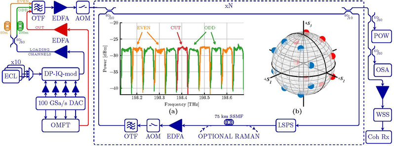 论文基于高速光纤通信传输实验平台,通过波分复用实现了11*200G=2.2Tb/s的高速光通信传输,经过接收端光电信号处理后,无错传输距离可达11,700 km(实验设计和传输平台见图1、图2)。该工作为陈斌在荷兰访问和学习期间同荷兰埃因霍温理工大学(Eindhoven University of Technology)多名教授合作的部分研究成果,该实验结果的前期理论及仿真结果已经以第一作者身份在光通信顶级杂志IEEE/OSAJournal of Lightwave Technology上发表(//ieeexplore.ieee.org/document/8718568)。本次获奖论文的实验结果进一步验证了该方法的有效性,与传统方法相比,可提升16%的传输距离。