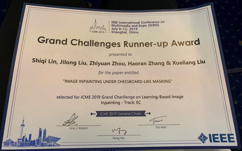 电信工16级本科生林诗琪、刘积隆、周致远和多媒体所张浩然博士生、刘学亮老师组成的队伍参与了其中的“基于学习的图像补全” 挑战赛,并获得亚军。