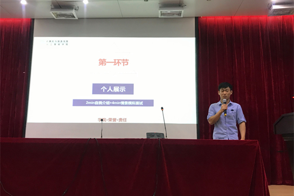 6月19日下午,计算机信息学院在建艺馆负一楼报告厅举办2019年模拟招聘大赛。活动邀请了中国银行软件中心人力资源部部长马晨阳,海康威视合肥技术面负责人刘玉奇,北京思特奇安徽分公司技术面试官王强,前程无忧面试官赵宇担任本次模拟招聘的模拟面试官,院团委相关负责老师、前程无忧校园部经理王恒帅出席了本次活动。
