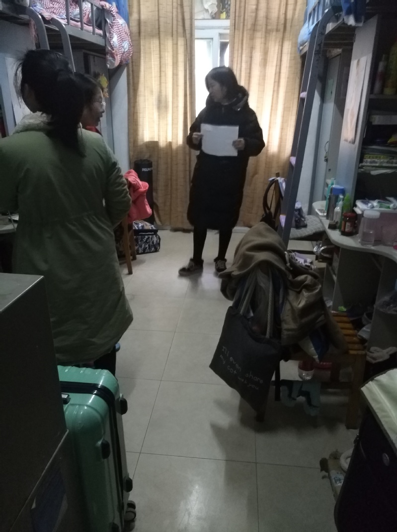 检查中,辅导员告诫学生务必不能私立乱扯电线和使用大功率电器,要严格执行在校的请销假制度,严查晚间学生晚归情况。特别是临近寒假假期,叮嘱大家要增强安全防范意识,离校后管好宿舍门窗,自觉维护寝室安全,共同维护学校的安全稳定。针对在检查中各班级宿舍中发现的安全隐患问题进行了汇总统计,建立了班级、宿舍整改清单,明确务必在规定时间内进行整改。