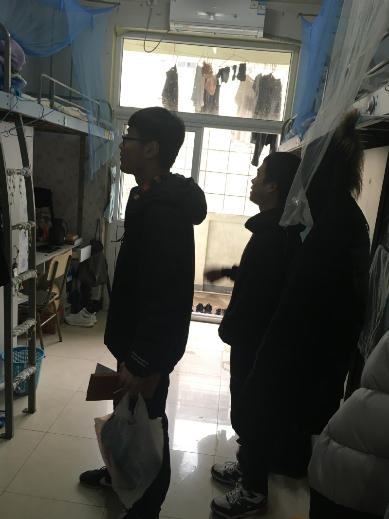 2018年今冬明春火灾防控工作方案》和学院《关于在全院开展安全生产检查和消防防控工作的通知》要求,结合2015级本科生的实际情况,1月10日上午,为切实做好毕业生学生公寓安全文明工作,创建安全稳定、和谐向上的住宿环境,学院2015级辅导员陈曾珍、刘世国与各班级负责人对照学生公寓安全隐患检查内容对学院2015级本科生宿舍逐一进行检查。
