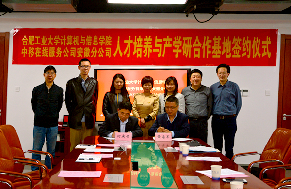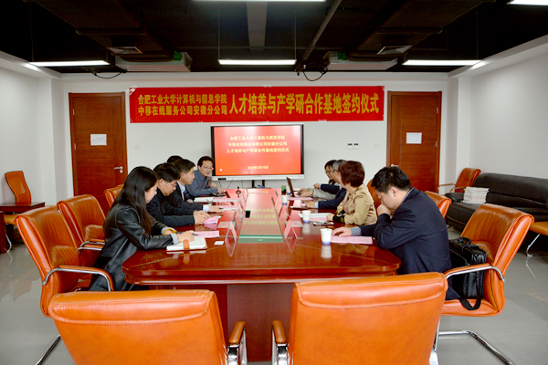 与中移在线服务有限公司安徽分公司产学研合作签约仪式在翡翠科教楼A1106举行。中移在线服务公司安徽分公司总经理黄海军、副总经理刘晓梅、人力资源部经理柯晓岚、系统支撑团队主管万鹏、p站