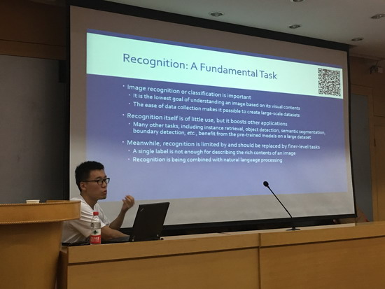 谢博士的报告从深度学习和卷积神经网络的发展历程展开,指出了该领域在近年来取得成功的关键,也点明了目前尚存的若干问题。谢博士进而从深度神经网络结构、迁移学习和网络模型理解三个角度出发,介绍了他近年来取得的一系列研究进展。谢博士在构建图像分类模型时提出了翻转不变神经元、神经元上下文、二阶响应单元等新结构,在分类识别任务中取得了优异的性能。谢博士继而指出了利用迁移学习思路将深度卷积网络应用至其他场合的重要价值,并介绍该思路在图像检索、医学图像分析之中的应用。谢博士最后介绍了对深度卷积网络内部工作原理的理解,通过设计了若干精妙的模型用以验证网络模型的特长与弱点。上述研究成果均发表于IJCV、CVPR、ICCV、ECCV等国际顶尖期刊和会议上。谢博士的报告条理完整清晰、内容丰富细致,引起了在座师生的高度兴趣,大家纷纷就自己感兴趣的话题与谢博士开展了探讨。