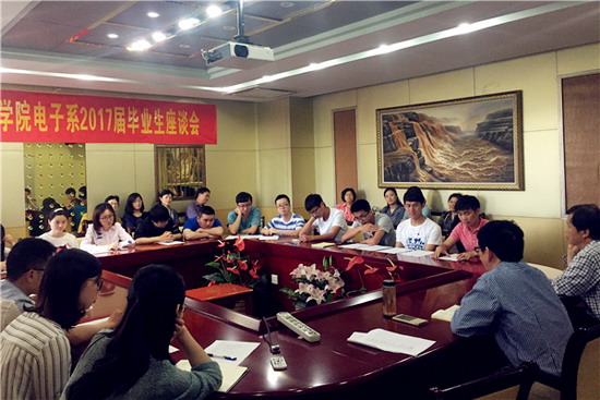 为了加强毕业生与学校之间的沟通交流,听取毕业生对于电子信息工程专业的教育、教学和学生方面的意见和建议,5月17日下午在逸夫楼408召开电子信息工程专业毕业生座谈会。学院相关职能部门老师、电子系任课老师与20余名优秀毕业生欢聚一堂,畅谈师生情谊。