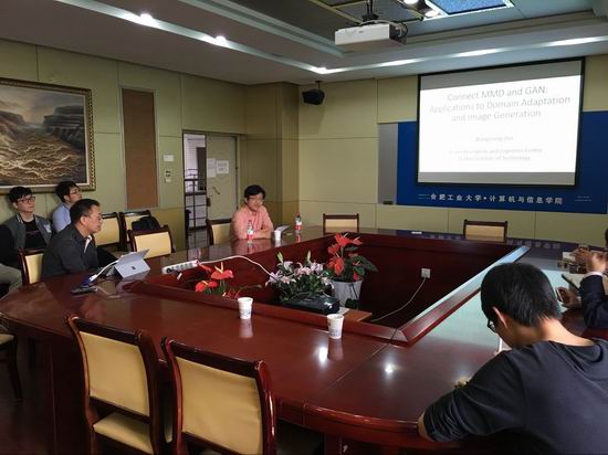 开展学术交流,并做了题为“Connect MMD with GAN: Unsupervised Domain Adaptation and Image Generation”的学术报告。报告会由学院汪萌副院长主持,来自p站