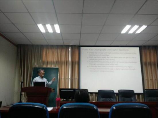 在长达两个小时的报告会上,许老师首先介绍了密码学领域的两个重要问题,公钥密码学及数字签名。而数字签名技术的发展使得电子订单或数字货币交易成为可能。此外,许老师介绍了密码学领域的另一重要问题--加密哈希函数,为大家普及了一些常用的哈希函数,如MD5,SHA1,SHA256等,并介绍了王小云教授对MD5的破解工作。在这些工作的基础上,许老师介绍了典型的数字货币,如早期的E-Cash,及当今火热的bit-coin。深入浅出地讲解了bit-coin所使用的区块链技术。最后许老师针对bit-coin所使用的数字签名技术,介绍了其在椭圆曲线领域的重要贡献,以及他们整理的古代数学家秦九韶做出的模逆运算的精妙算法,指出我们古人在数学领域的突出贡献。为青年学者和同学今后的科学研究工作提供了一个崭新的方向。
