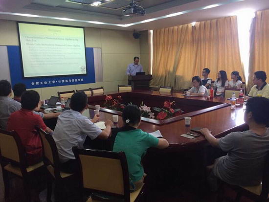 已有一位教师与一位硕士通过其博士资格考试,在ODU攻读博士学位。黎耀杭博士在报告中介绍了ODU大学,并多次褒奖我们输送的两位优秀博士。整个报告是以大数据为起点展开的,针对在数据量极具增长的情况下,大规模矩阵运算是所出现的问题以及解决途径。首先,回顾了经典的乌兰•冯•诺伊曼算法,该方法用于线性算子方程。在蒙特卡罗与诺伊曼体系的中,其收敛的充分必要条件是一个长期被使用的法则。然而经典的乌兰•冯•诺伊曼算法收敛速度较慢,限制了其在一般线性系统的应用。通过在Krylov子空间中估计大系数矩阵的特征值与特征向量,在采样迭代采样过程中逐渐对特征值和特征向量精炼求优,进而在KryLov子空间中进行蒙特卡罗采样,得到的特征向量插入Krylov子空间后压缩进而加速线性求解的收敛。这种方法的内存和矩阵的有效性都得到了提升,可以在CPU处理器结构上高效地的实现。最后,黎博士介绍了该方法在生物信息学、图像分割、比赛预测等领域的广泛应用。