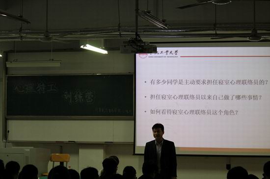 大学生发展辅导中心举办的“心理特工训练营”在翡翠湖校区正式启动。学院2014级班级心理委员和寝室心理联络员共100余人参加此次培训。