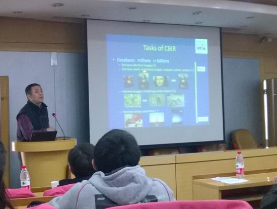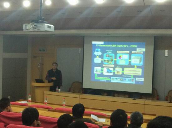 田奇教授首先完整地回顾了视觉信息检索的研究发展历程,介绍了该研究方向的发展现状。通过生动的分析与论述,田教授进一步向大家介绍了大规模视觉信息检索所需要解决的四项关键技术;并逐一展示了所领导研究团队取得的丰硕学术成果。报告结束后,田奇教授现场为在座师生演示了其团队开发的视觉信息搜索原型系统,并通过实例详细地分析了实验结果反映的各种现象与规律。本次报告引起了在座师生很大的兴趣,多位老师和同学在报告间隙和结束时与田奇教授进行交流与互动。