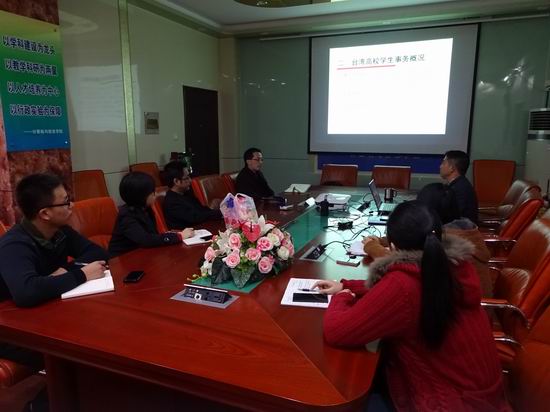 2014年11月6日晚7:00,关于“基于台湾高校学生工作调研上的以学生为主体的学生事务”沙龙在科技楼516举行。何庆领副书记结合自身赴台高校调研经历,综合分析了台湾高校学生事务工作的特点,探讨如何将学生事务管理与学生思想政治教育分离以及通过何种载体将学生思想政治教育落到实处。学院部分教师以及全体辅导员参加了此次沙龙。