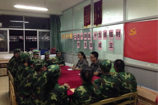 结合实际情况把新生军训和新生党员教育紧密结合,在新生所在二营十四连、十五连联合成立临时党支部。支部成员包括十四连指导员李晓雨老师、十五连指导员宋燕老师,学生党员2名,入党积极分子12名,十五连指导员宋燕老师担任临时党支部书记。
