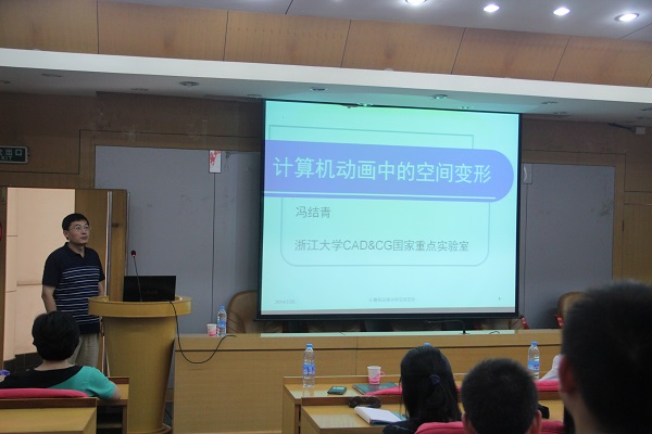 冯结青教授的报告题目为“计算机动画中的空间变形技术”,以其近二十年中对网格变形问题的研究为主线,不仅对动画空间变形技术的研究现状、具体的解决方法进行了介绍,更是强调了二十年中的研究走向,各种研究新想法出现的契机,以及团队成员在此工作中所做出的努力。