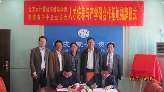 与安徽省中小企业协会人才培养与产学研合作基地签约仪式在科技楼学院会议室举行。安徽省中小企业协会副会长兼秘书长王成友、副秘书长卢昌玖、副会长罗育万,校专业学位教育办公室主任王磊,学院副院长杨学志,计算机系主任路强和通信系主任丁志中出席仪式。签约仪式由路强主持。
