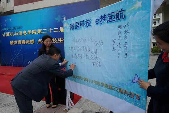 在翡翠湖校区一食堂广场隆重举行科技节系列活动开幕式。市科协主席金维平,校团委书记陈文恩,党委学工部副部长葛万锋,p站