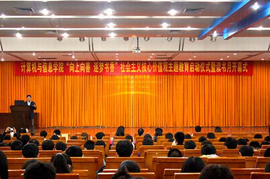 “向上向善,逐梦书香”社会主义核心价值观主题教育活动启动仪式暨读书月开幕式于翡翠湖校区图书馆报告厅成功举行。校党委学工部部长王峰老师、马克思主义学院檀江林教授、学院相关负责人出席本次活动。