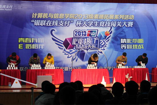 12月8日晚,p站 “筑梦青春”2013级素质拓展系列活动第二季暨“银联在线支付”杯大学生竞技闯关大赛在翡翠湖校区综合楼301室圆满落幕。中国银联安徽分公司和我校党委学工部、p站 相关单位负责人出席了本次活动。
