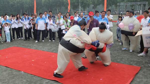 比赛中,运动健儿发扬了团队合作和坚持不懈的精神,拉拉队员们激情助威,让现场一片紧张欢腾。在“登人梯咬苹果”和“动感五环”的比赛中,团队合作精神表现得尤为突出。“气球胖子大格斗”和“斗鸡”的比赛更是实力和技巧的比拼,场上高潮迭起,欢声笑语直冲云霄。各参赛队在老师和同学们的呐喊和鼓励声中,同场竞技,努力拼搏,勇往直前!同时,2011级研究生各班级之间还进行了专项拔河比赛。