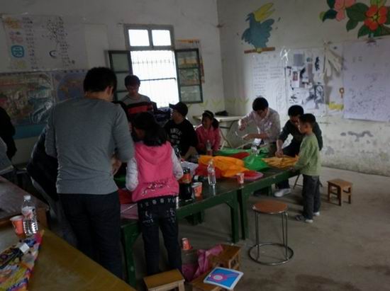 4月8日上午,计算机科学与技术08-1班党支部罗长志等十二名党员同学,带着竹篾、彩布等做风筝的材料,以及炽热的心,来到肥西县上派镇方岗村,希望给当地的孩子带去承载梦想的翅膀--风筝,用自己的双手,把梦想放飞到远方。虽然才刚过正午,但孩子们就已经在方岗村活动室玩耍起来了。没有课的周末,或许只有活动室伙伴们之间的互相陪伴,才能平静孩子们心中那颗想念父母的心。