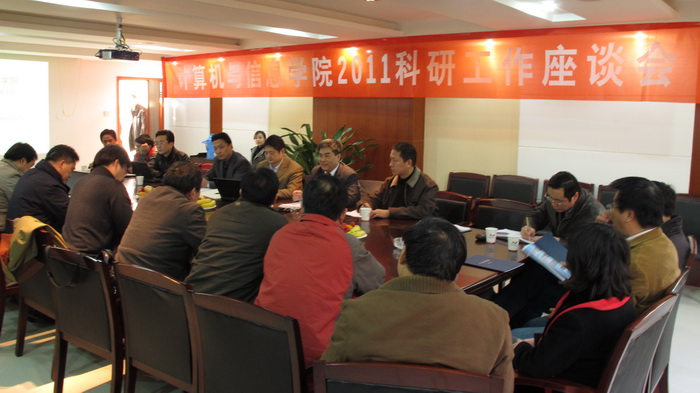 2011年12月17日下午,p站 科研工作2011座谈会于文达大厦举行,学院领导班子成员、系主任、科研工作者代表共20余人出席会议,会议由刘晓平院长主持,科研院长杨学志做主题发言,韩江洪副校长发表重要讲话。