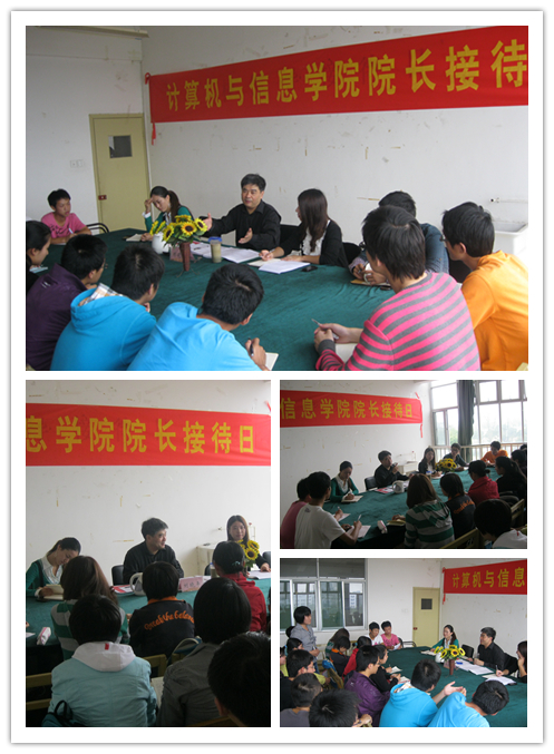 于10月11日10:00—12:30在翡翠湖校区综合南楼307室举行了院长接待日,计算机、信息安全、电子工程、物联网、通信工程等专业的40余位学生代表参加了本次活动,刘晓平院长率一、二年级辅导员认真听取了同学们对课程学习、实验活动、业余生活等方面的报告,询问了上述活动中所遇到的困难以及学院在管理方面所存在的不足,同学们提问踊跃、与院长和辅导员互动不断,问题涉及大学生创新课题申报以及指导、程序设计上机安排、人文素质培养及名人报告会、精简学时之后的教学内容安排、民族地区学生的特殊政策等,最后院长强调了大学学习自主性、独立性,告诫大家学科知识和文化并重,认真对待学生评教,要求同学主动学习,对自己高标准、严要求。