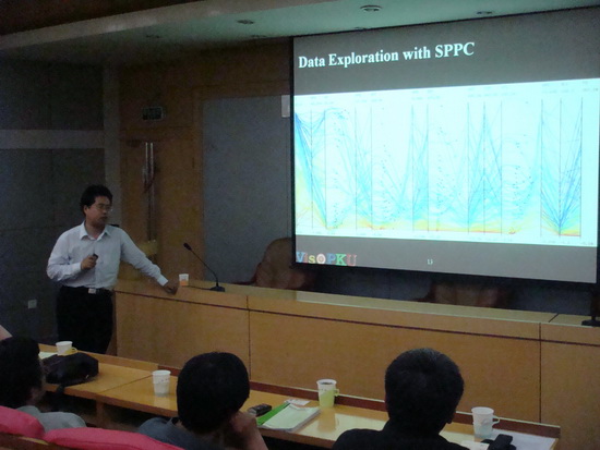 师生作了题为“高维数据可视化与交互分析研究”的学术报告。刘晓平教授主持报告,刘雨副秘书长和学院相关教师、研究生出席了报告会。报告从如何通过引入信息可视化和人机交互的新手段分析处理复杂科学数据,构建人与数据沟通的桥梁开始,介绍了复杂高维时空数据可视分析技术,并通过案例介绍了可视化分析在大气模拟数据、地震目录数据、交通轨迹数据、生物医疗数据等领域的应用。报告会上,师生提问踊跃,气氛热烈,袁晓如博士的精彩回答博得了全场的阵阵掌声。 报告会后,袁晓如博士和刘雨秘书长参观了计算机应用技术研究所,并进行了交流。