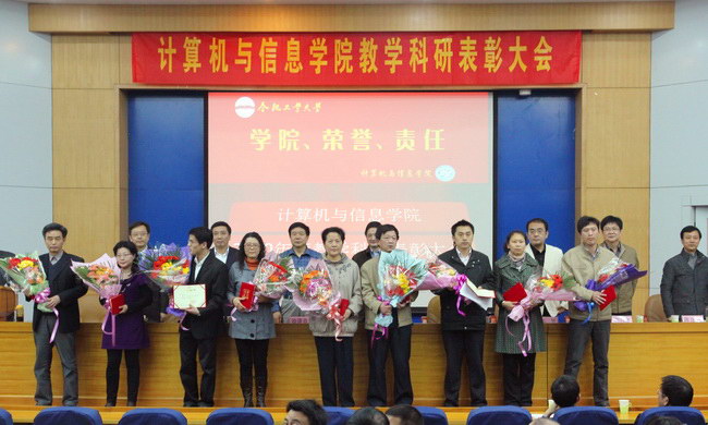大会对2010年度科研项目纵向到账经费50万以上、横向到账经费100万以上的个人授予了“2010年度承担科研项目个人优秀奖”;对2010年度学生评教中综合排序前二十名的个人授予了“2010年度学生评教个人优秀奖”。会上,学院分党委书记蒋建国作了发言,提出了“职业当事业”的理念;教务处张辉处长发言指出教学科研工作要取得成绩,贵在“坚持”,并结合计算机专业认证工作进行了工作动员和布置;科研院科学研究处处长徐进章对学院过去一年的科研工作进行了肯定,并对年轻教师寄予厚望。