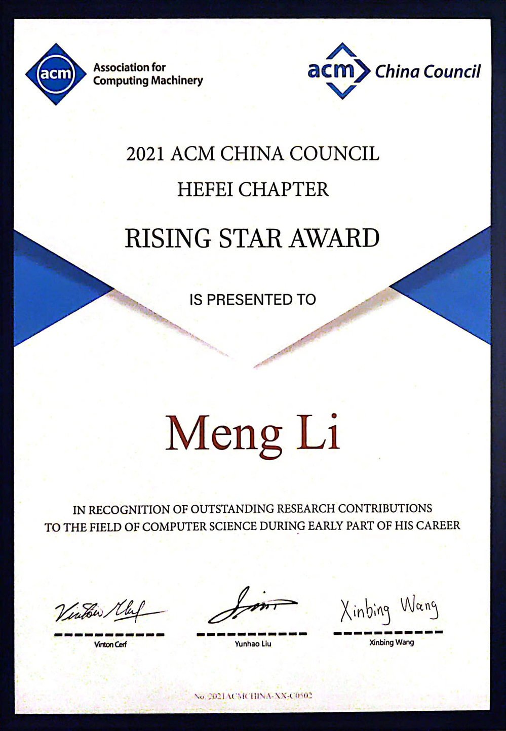 为表彰中国计算机领域的青年学者所取得的研究成绩,并进一步推动青年学者在科研领域的发展和进步,从2014年起,ACM中国理事会设立ACM中国新星奖,每年评选出1-2名在计算机领域展现出突出科研潜力的青年学者为获奖者。该奖的选拔是基于候选者在计算机和(或)通信系统相关领域内,所创建的新的理念、模式、和新的系统等研究成果产生的影响,研究成果可以是理论、经验或实验方面的。深度和影响力都是评奖所考虑的重要因素。获奖者同时会获得1万人民币的奖励。颁奖仪式会在次年召开的ACM中国图灵大会期间举行。ACM合肥分会是经ACM总部批准,由ACM中国理事会在中国大陆地区设立的二级分支机构,致力于为安徽省和周边地区计算机领域的专业人士提供优质服务。