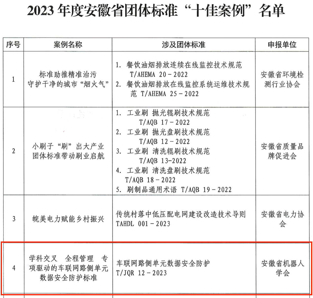 胡东辉教授团队依托安徽省机器人学会申报的团体标准(T/JQR 12-2023,车联网路侧单元数据安全防护)荣获2023年度安徽省团体标准典型案例中的“十佳案例”。