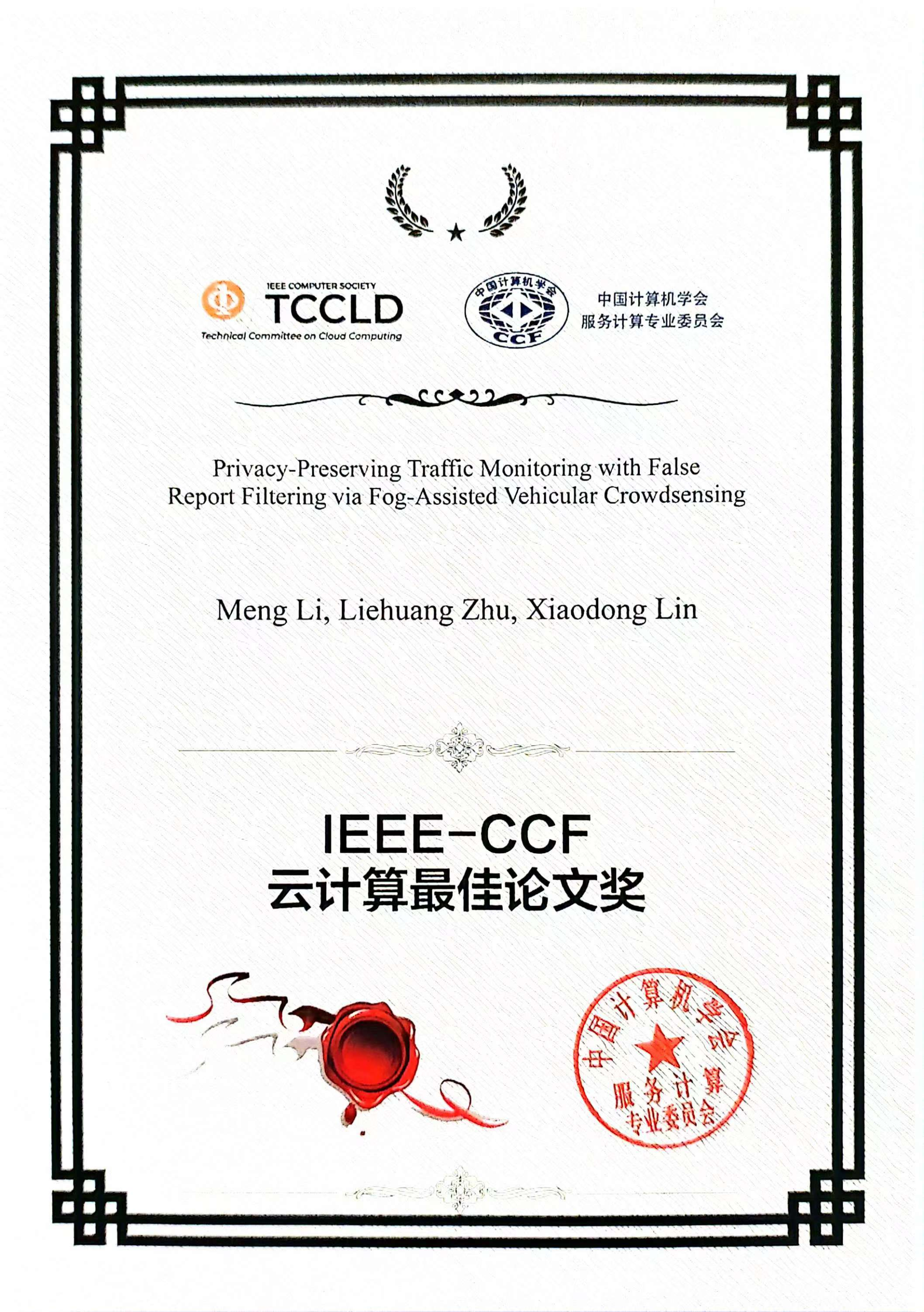 李萌副研究员带领的泛在隐私实验室近年面向车联网和云计算,在数据安全和隐私保护研究方向开展深入研究,取得了系列研究成果。其中一个成果的论文“Privacy-Preserving Traffic Monitoring with False Report Filtering via Fog-assisted Vehicular Crowdsensing”,发表在CCF A类推荐期刊IEEE TSC(IEEE Transactions on Services Computing)上,并在2024年9月13日获得IEEE-CCF云计算最佳论文奖。该研究成果是和北京理工大学、圭尔夫大学合作,基于密码学、云计算和边缘计算,帮助解决车联网交通监测场景中安全过滤虚假路况信息的问题。