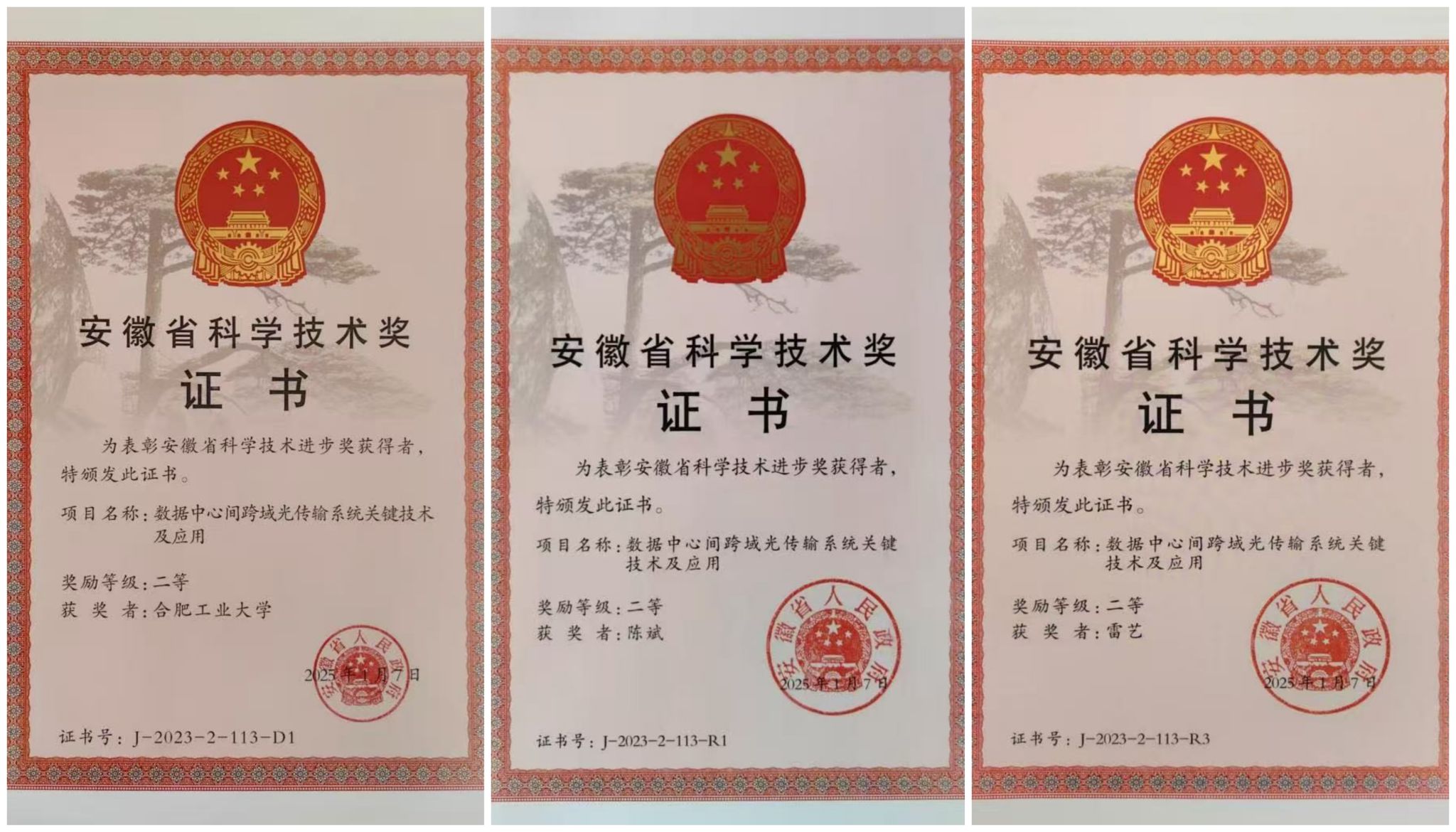 作为第一完成单位联合申报的“数据中心间跨域光传输系统关键技术及应用”项目,荣获2023年度安徽省科学技术进步奖二等奖,标志着学院在产学研协同创新与关键技术落地应用取得重要进展。