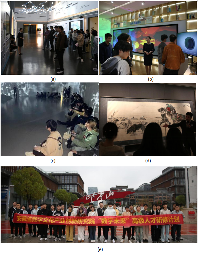图3 (a)(b)参观紫云山(包河)文化创新产业园;(c)观看省美术馆数字艺术展;(d)听讲解员介绍画家创作过程;(e)参加活动的学员合影。