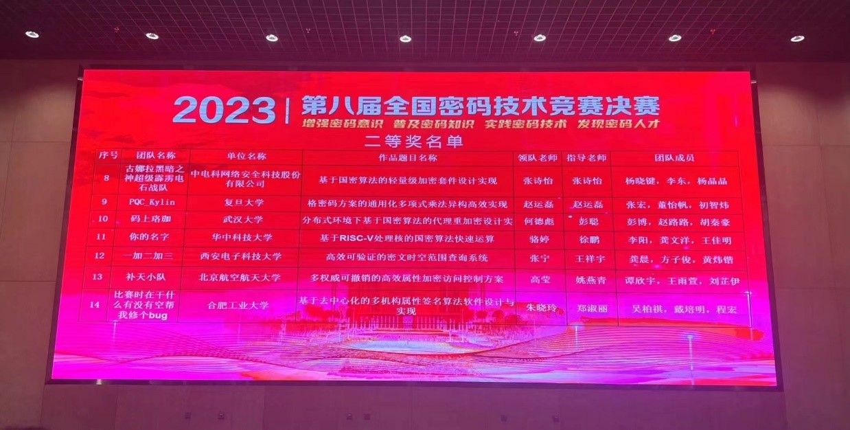 From November 23rd to 25th, 2023, the finals and award ceremony of the 8th National Cryptography Technology Competition concluded successfully at the Bodha Campus of Xinjiang University. The competition attracted more than 1,500 students, teachers, and technology professionals from 488 teams representing 93 universities, research institutions, and cryptography industry units from across the country. The competition lasted for six months, with 146 teams advancing to the finals. Among them, 19 teams received first prizes, 35 teams received second prizes, and 87 teams received third prizes.