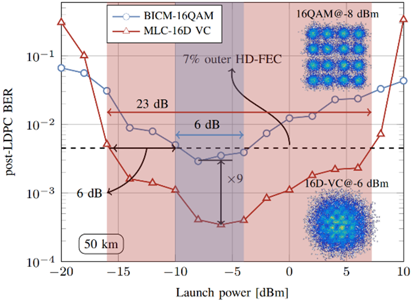 Figure 4: Post-LDPC BER as a function of launch powers via 4-core transmission for 16QAM and 16D-VC with the net information rate around 530 Gbps