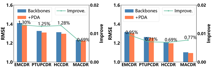 TABLE 2: Ablation study of MACDR on the Sports-Clothing dataset(task1). ”MACDR-w/o PDA” denotes removing the PDA optimization of MACDR. ”MACDR-w/o PMOE” denotes using a linear mapping function instead of PMOE for MACDR. ”MACDR-w/o PMOE+PDA” denotes removing PDA and PMOE modules