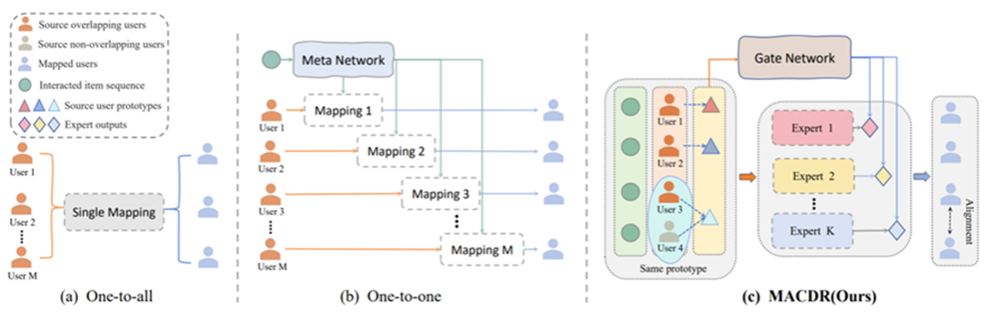Fig. 1: Illustration of three mapping functions. (a) One-to-all [25, 18, 22]: all users share the same mapping function; (b) One-to-one [51, 41]: each user has a personalized mapping function; (c) MACDR (Ours): we propose a Prototype enhanced Mixture-Of-Experts (PMOE) based mapping function to capture the transfer patterns of common and personalized preferences and design an unsupervised preference distribution alignment (PDA) optimization to better exploit the nonoverlapping users, following the assumption that users with the same prototype have closer representation after mapping