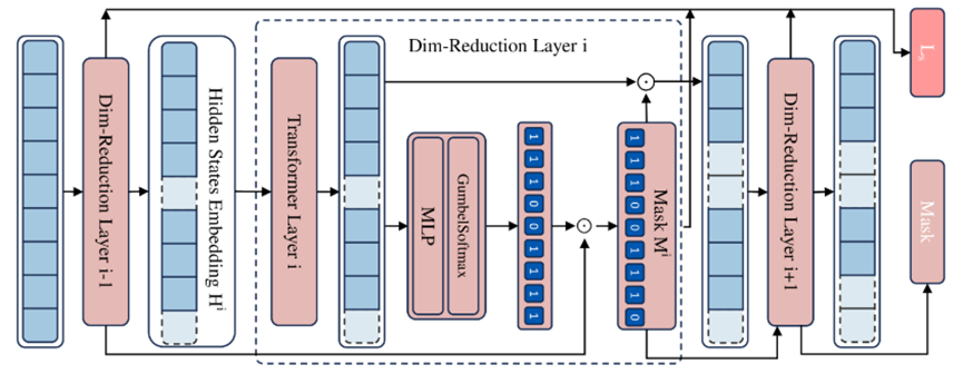 Figure 4. Detailed Design of the Dimension-Reduction Layer: The input is the hidden states H. The outputs are the final rationale mask M and the sum of all sparsity and continuity control losses