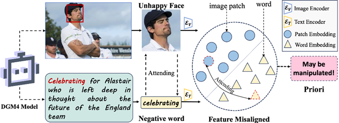 Figure 1. Fine-grained understanding of the multimodal media is one of keys for detecting the manipulated media. The capture of the misaligned components between the image and the text can effectively assist the DGM4 task
