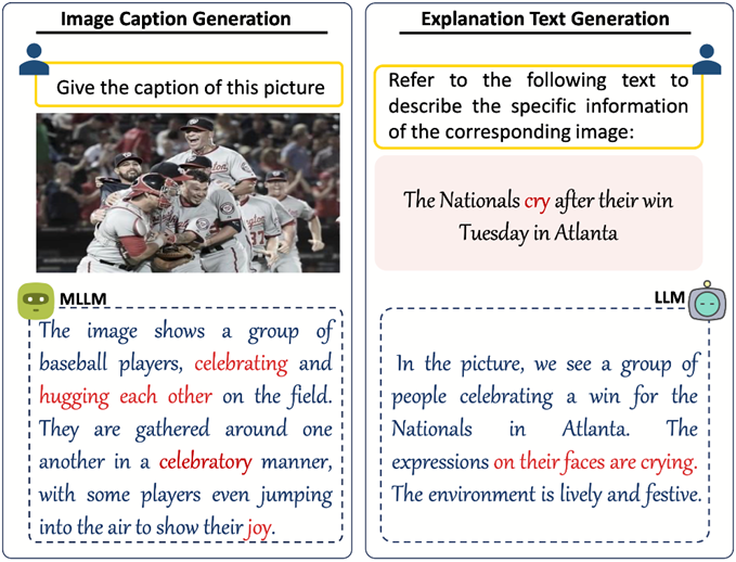 Figure 2. Illustration of the generation of image caption (left) and explanation text (right). The auxiliary texts can be effectively harvested via the off-the-shelf large models with the carefully crafted instructions