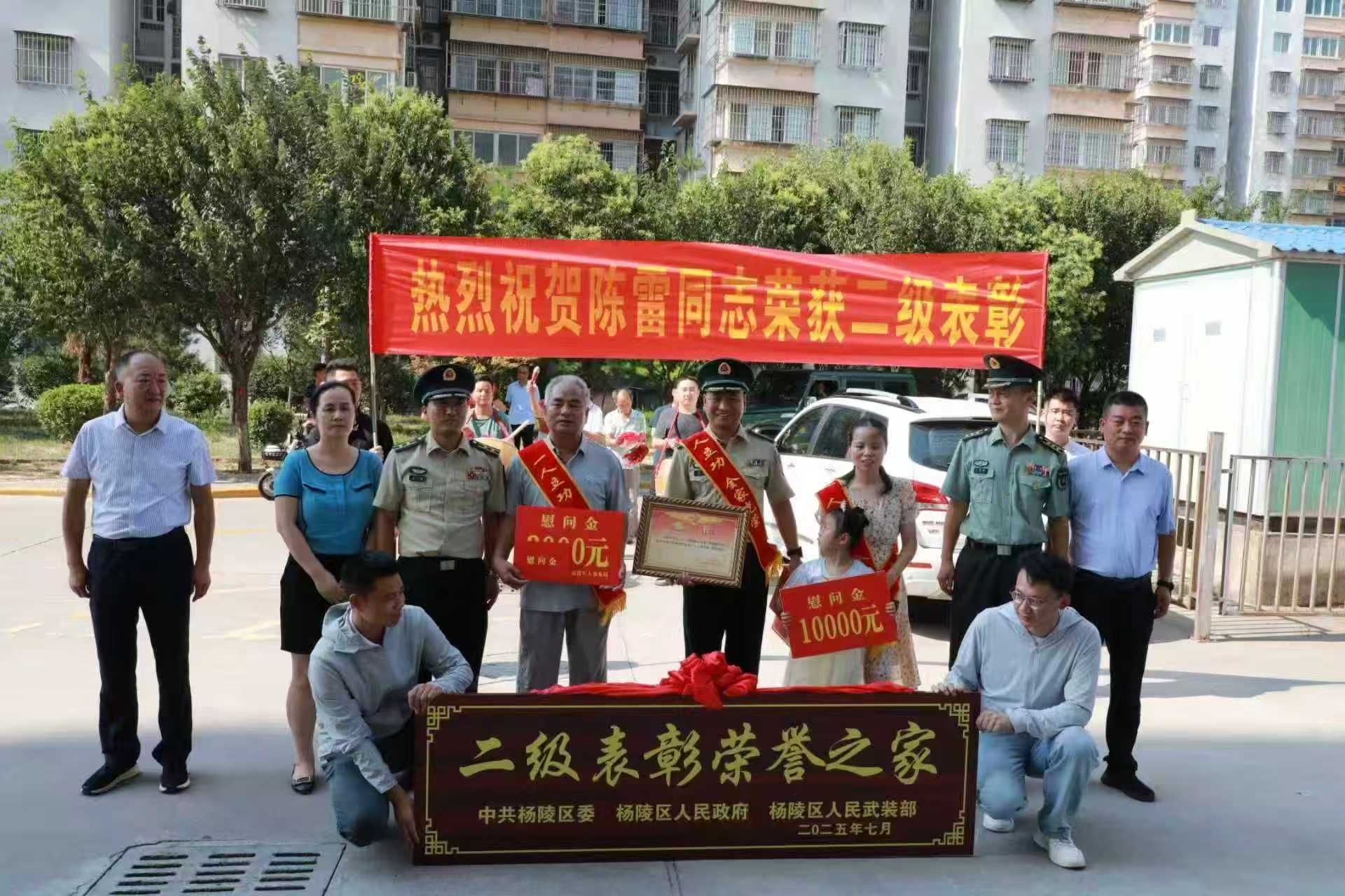 2025年7月30日,杨陵区街头锣鼓喧天,一场特殊的送喜报仪式在此举行。中共杨陵区委、区政府、区人民武装部联合陈雷所在部队代表,将镌刻着“二级表彰荣誉之家”的牌匾、慰问金及慰问品送至陈雷家中,以最朴实而热烈的方式,向这位p站